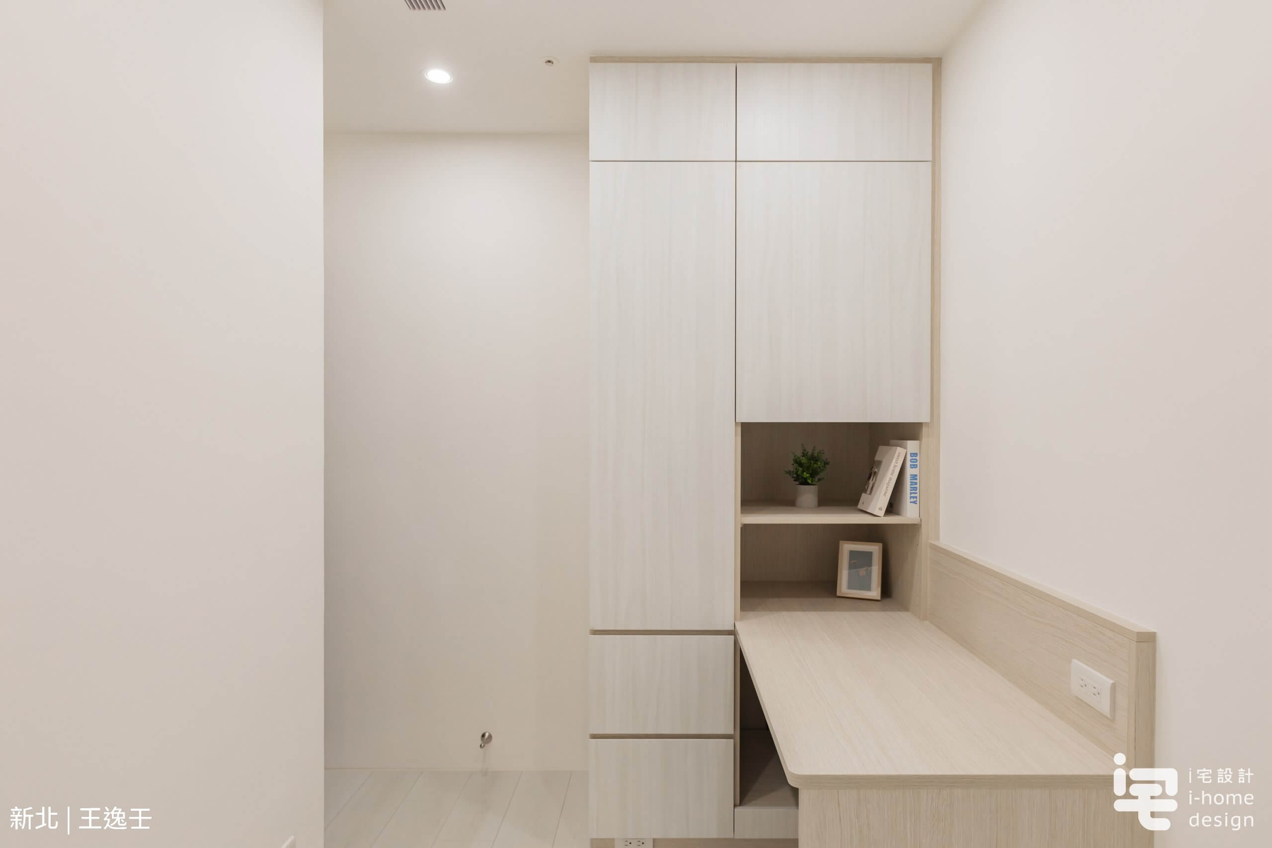 ▼設計師將衣櫃、書架、工作桌整合於一體,運用淺色木紋板材從地面延伸至天花板,創造出高效率的垂直收納牆。書桌嵌入櫃體結構中,側邊配置插座,開放層架方便收納書籍與小物,滿足現代工作學習的需求,也是小宅最常見、也最實用的配置之一。
