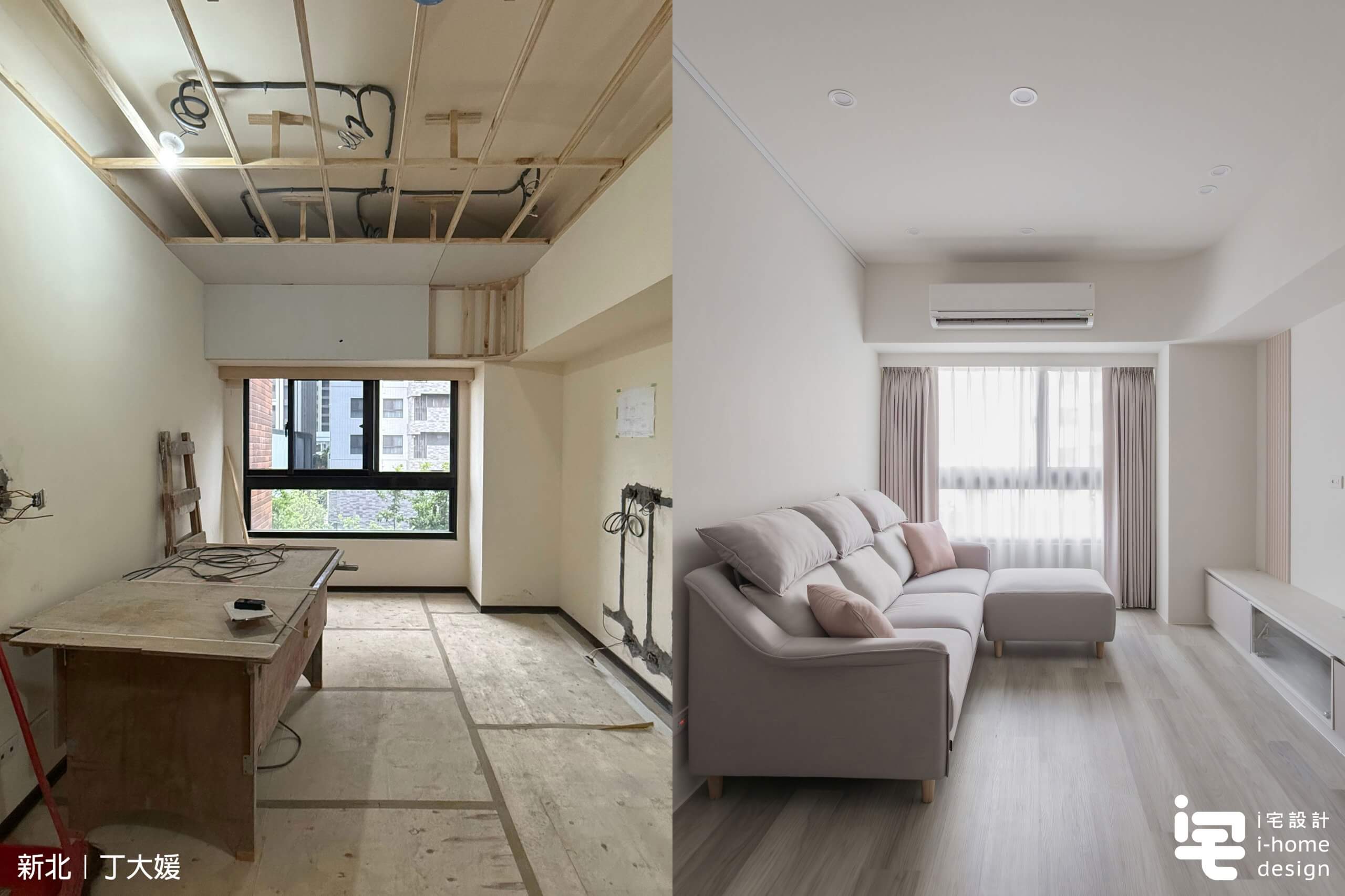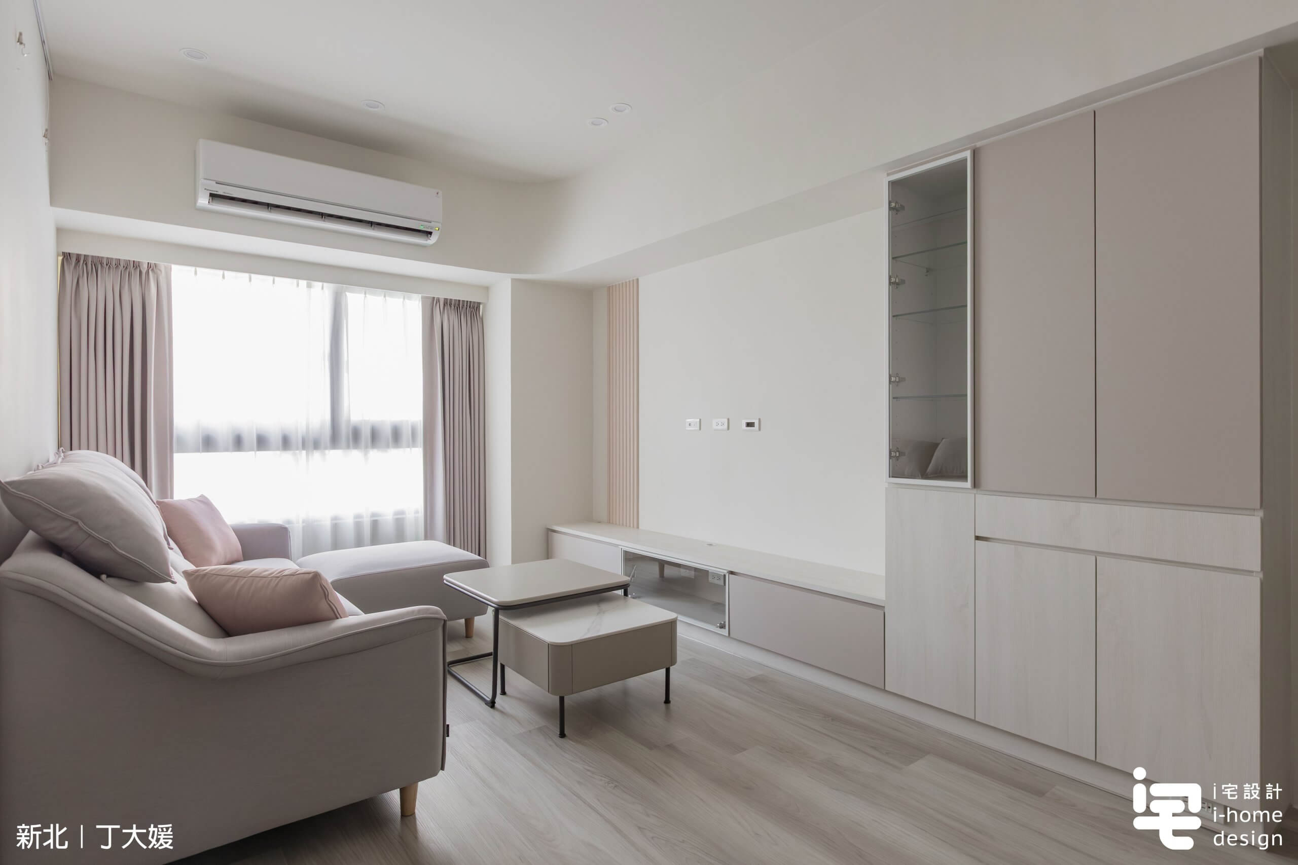 ▼客廳設計中,設計師針對結構大樑進行圓弧收邊設計,有效柔化原本銳利的結構線條,降低空間壓迫感,使整體客廳空間更顯包容與舒適。整體色彩配置以霧白與奶灰粉調為主,營造乾淨、純淨且耐看的視覺氛圍,提升小宅客廳的空間質感與舒適度。