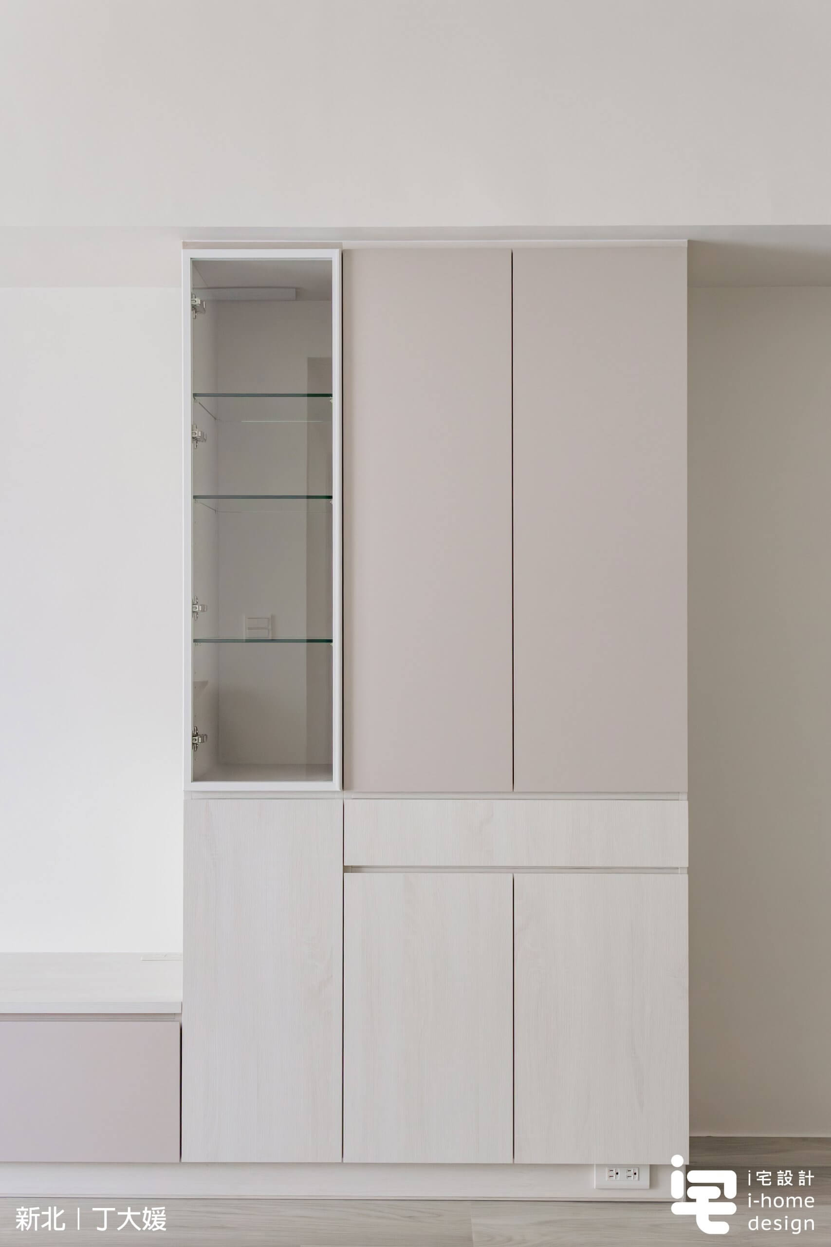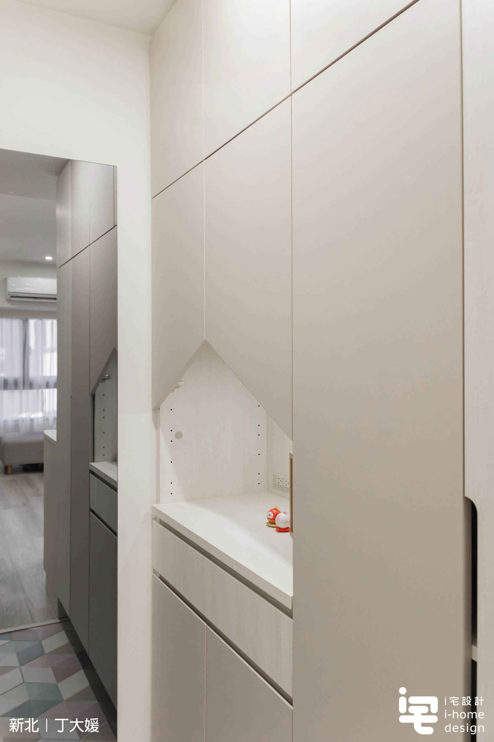 ▼幾何秩序裡藏進一點童心,利用系統櫃門片打型,形塑屋主心中理想的「家」的意象,讓回家的第一步兼具機能與情感溫度,成為理性與溫柔並存的空間起點。