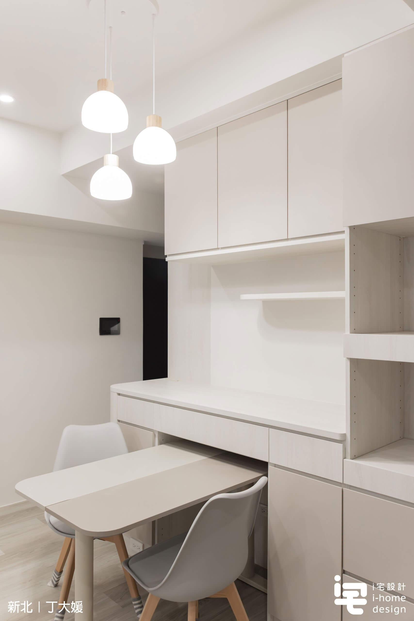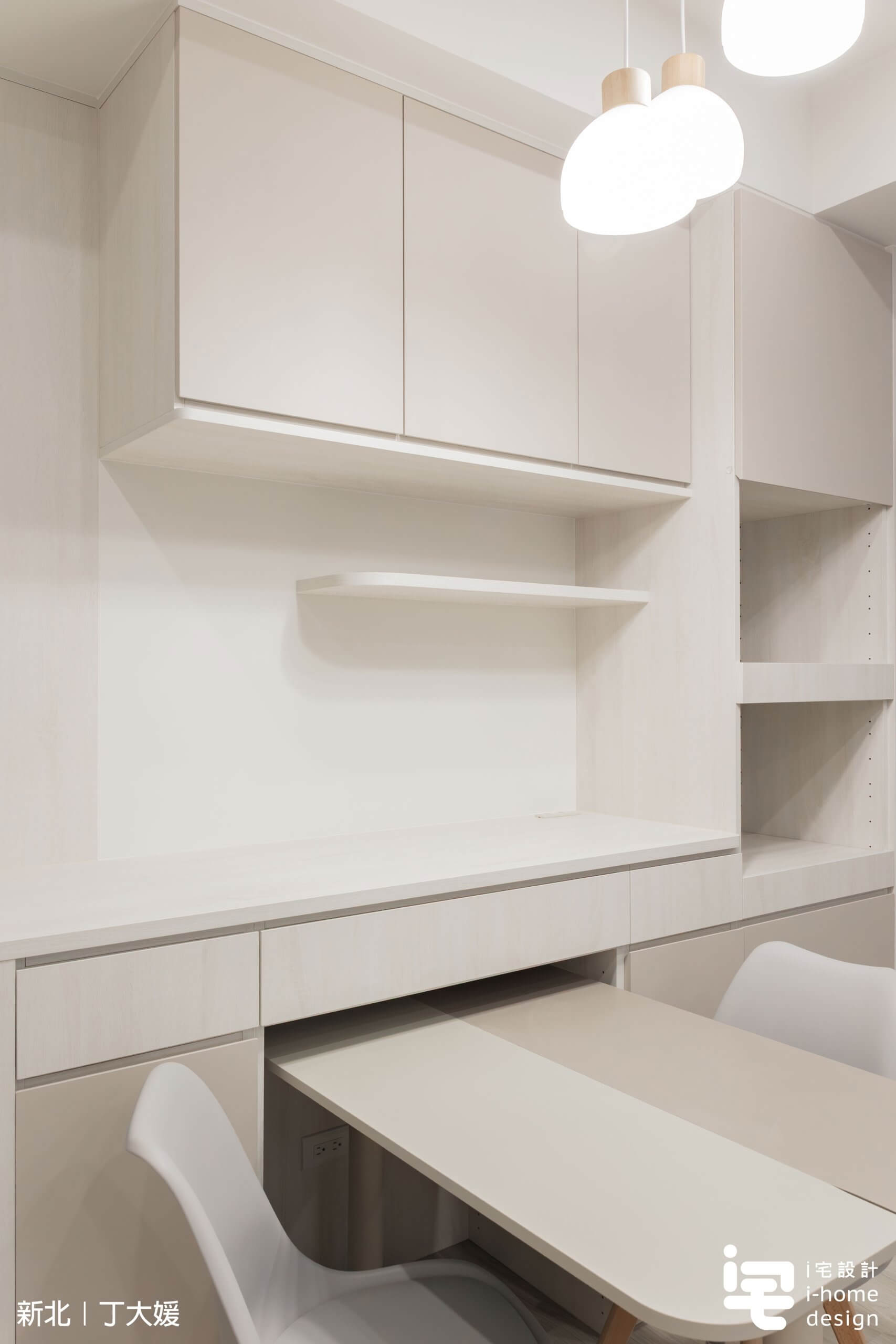 ▼餐邊櫃規劃中整合收納空間與餐桌配置,讓餐桌具備彈性使用機能,可因應不同生活情境調整使用方式。吊櫃則採懸浮式設計,搭配開放層板,形成半開放收納比例,在提升實用機能的同時,也降低視覺壓迫感,讓小宅餐廳空間維持輕盈與舒適。