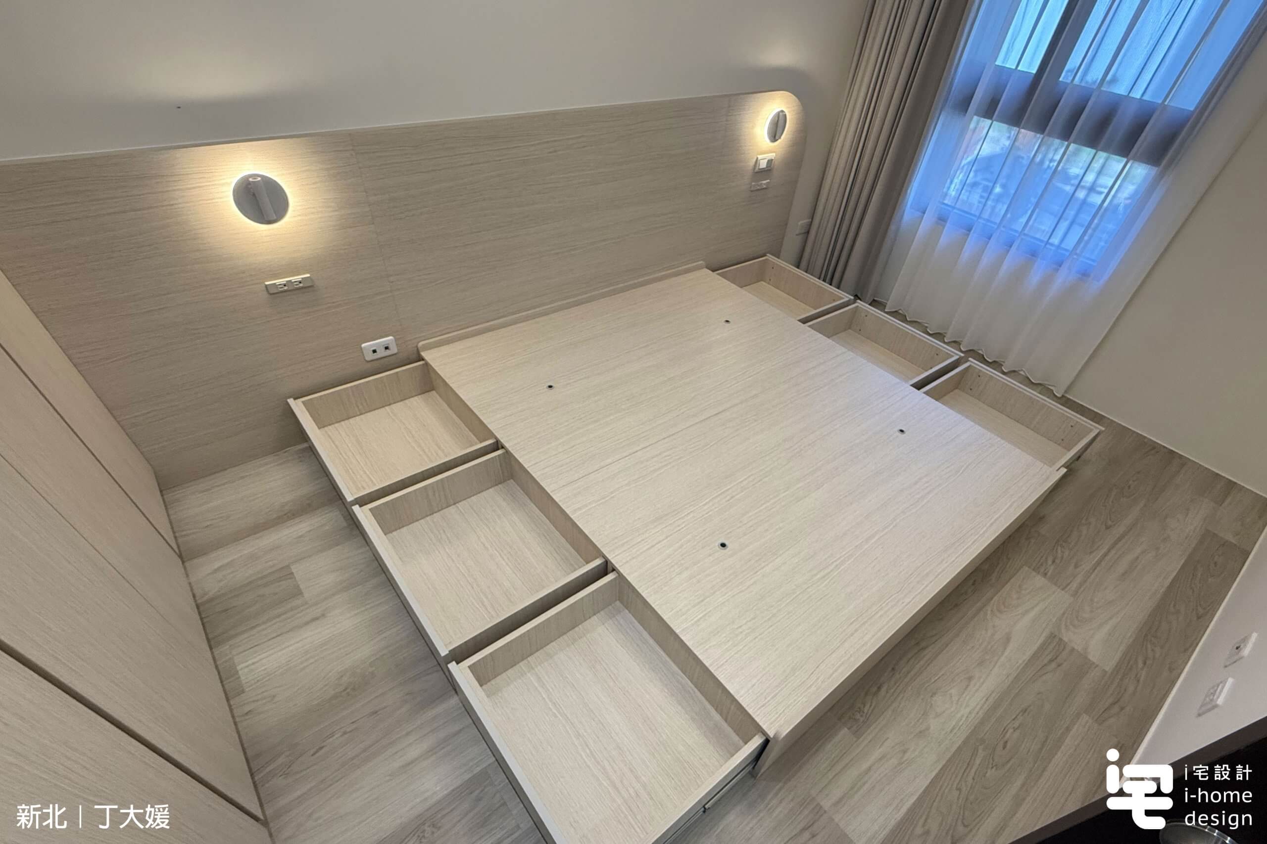 ▼床架下方規劃抽屜式收納,完整利用床體底部空間,達到隱藏式收納效果,兼顧美感與實用機能。
