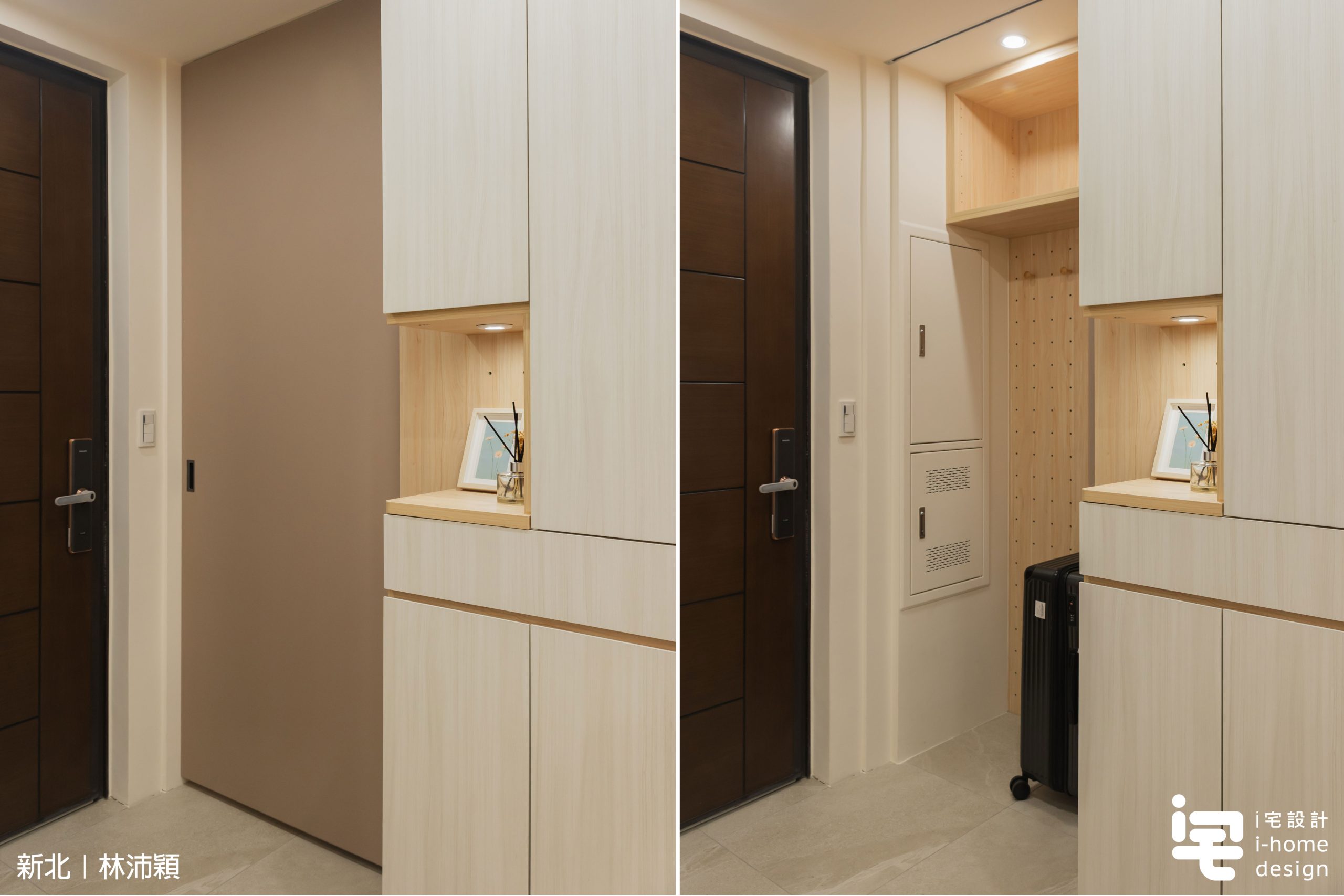 ▼收納規劃方面,玄關透過口袋滑門整合行李箱收納、日用品收納與儲藏機能,並搭配洞洞板收納系統,提供彈性調整與多元使用方式,提升小坪數玄關收納效率。落塵區以異材質地坪清楚界定,強化動線分區與日常使用便利性。