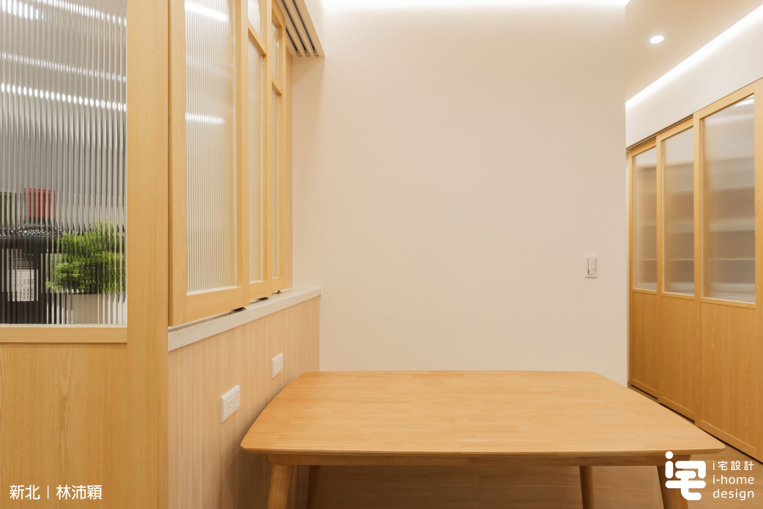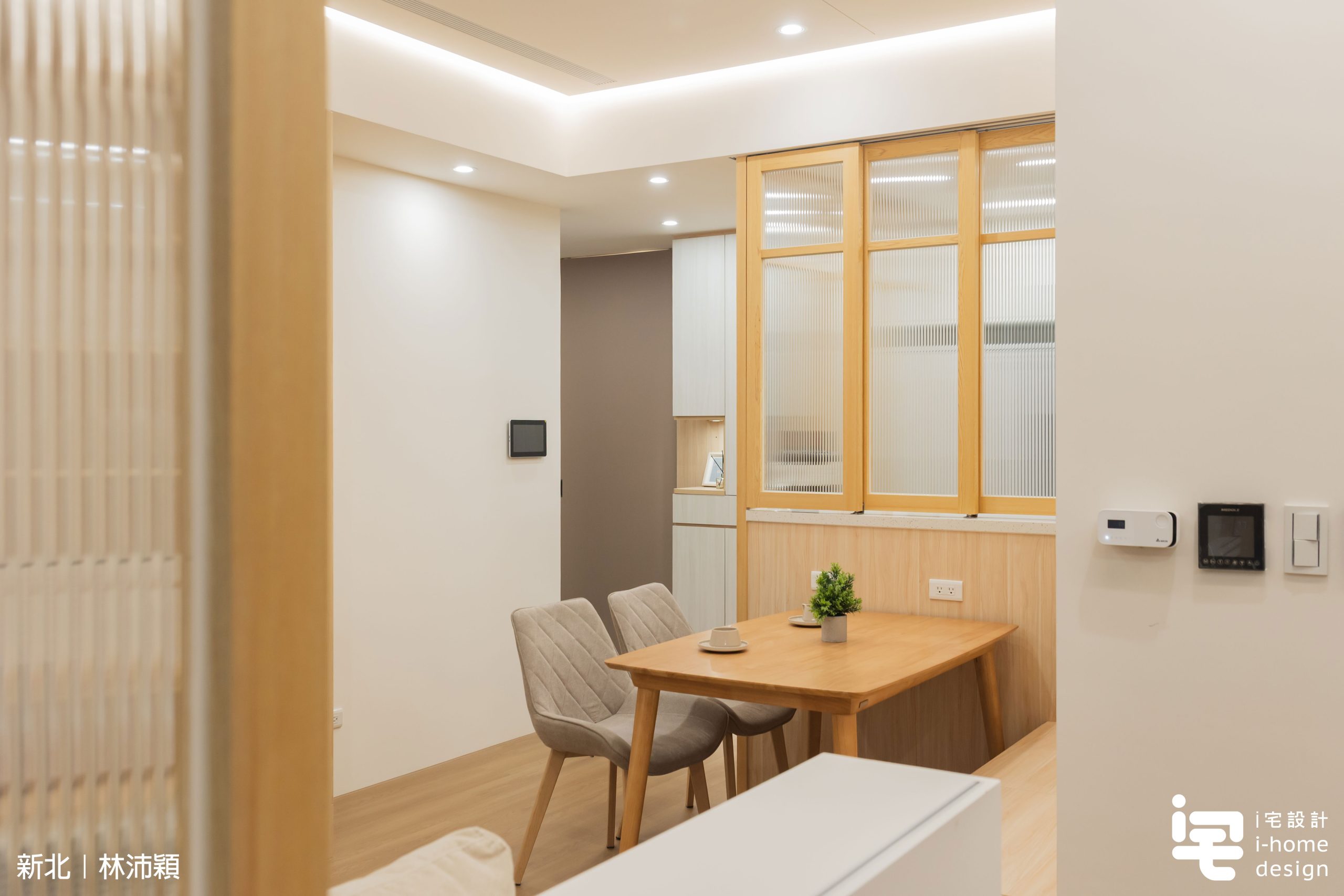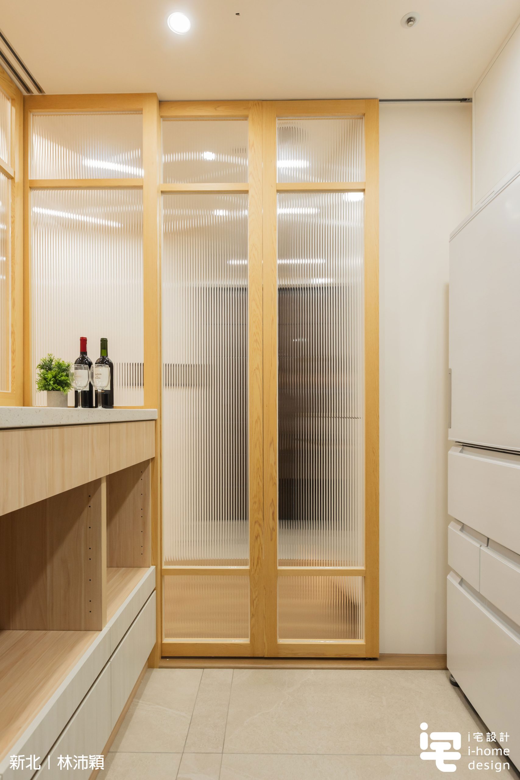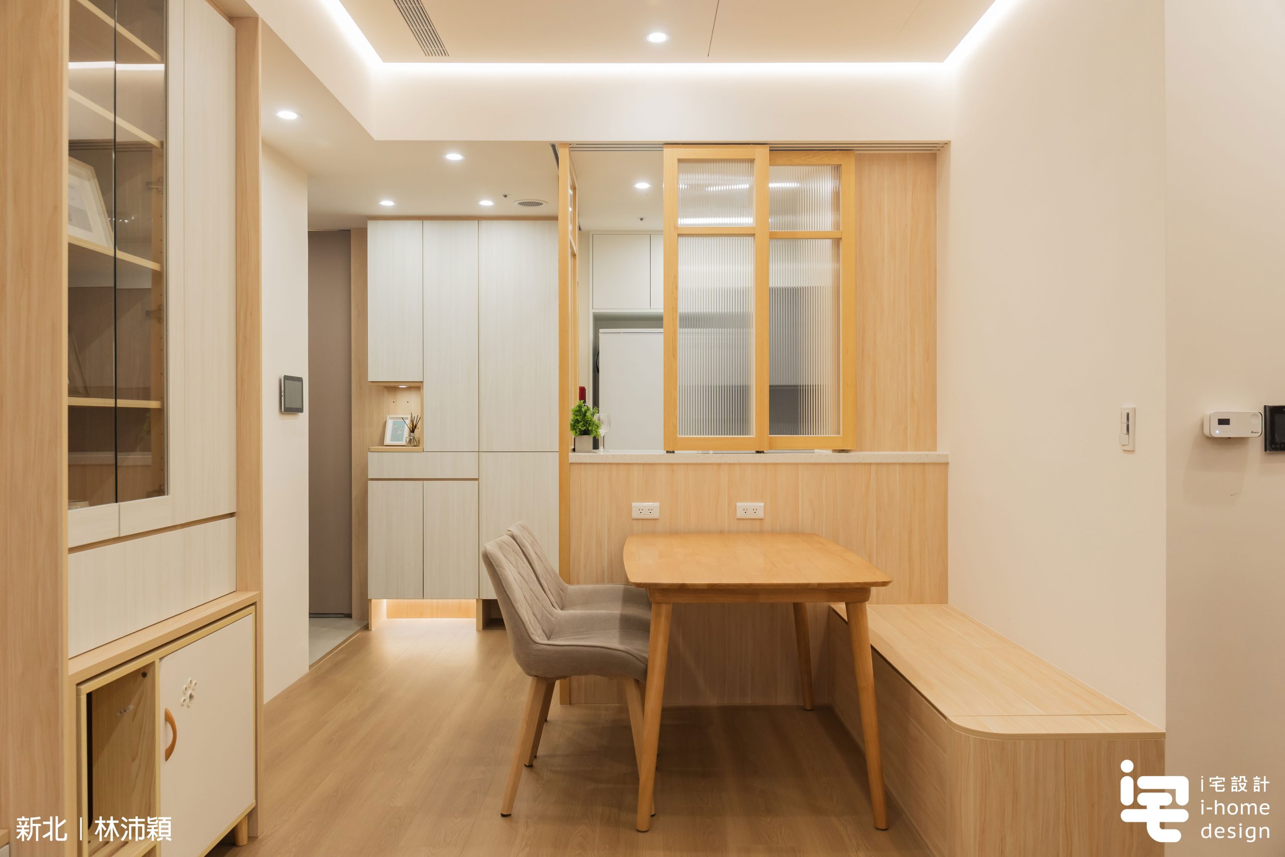 木作框搭配貼木皮與長虹玻璃,使廚房成為「隔而不斷」的場域,自然光線得以流動,提升整體日式空間質感。