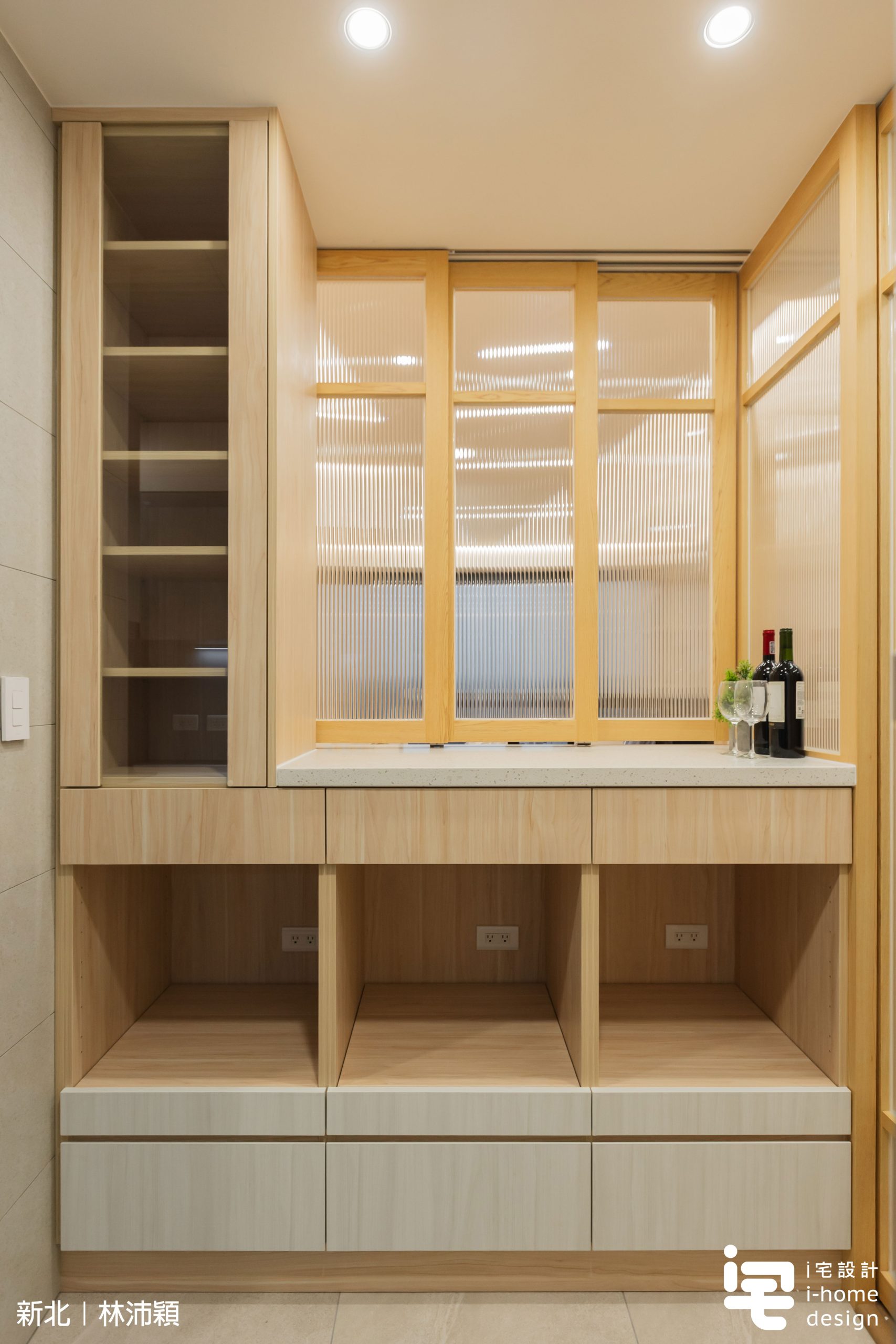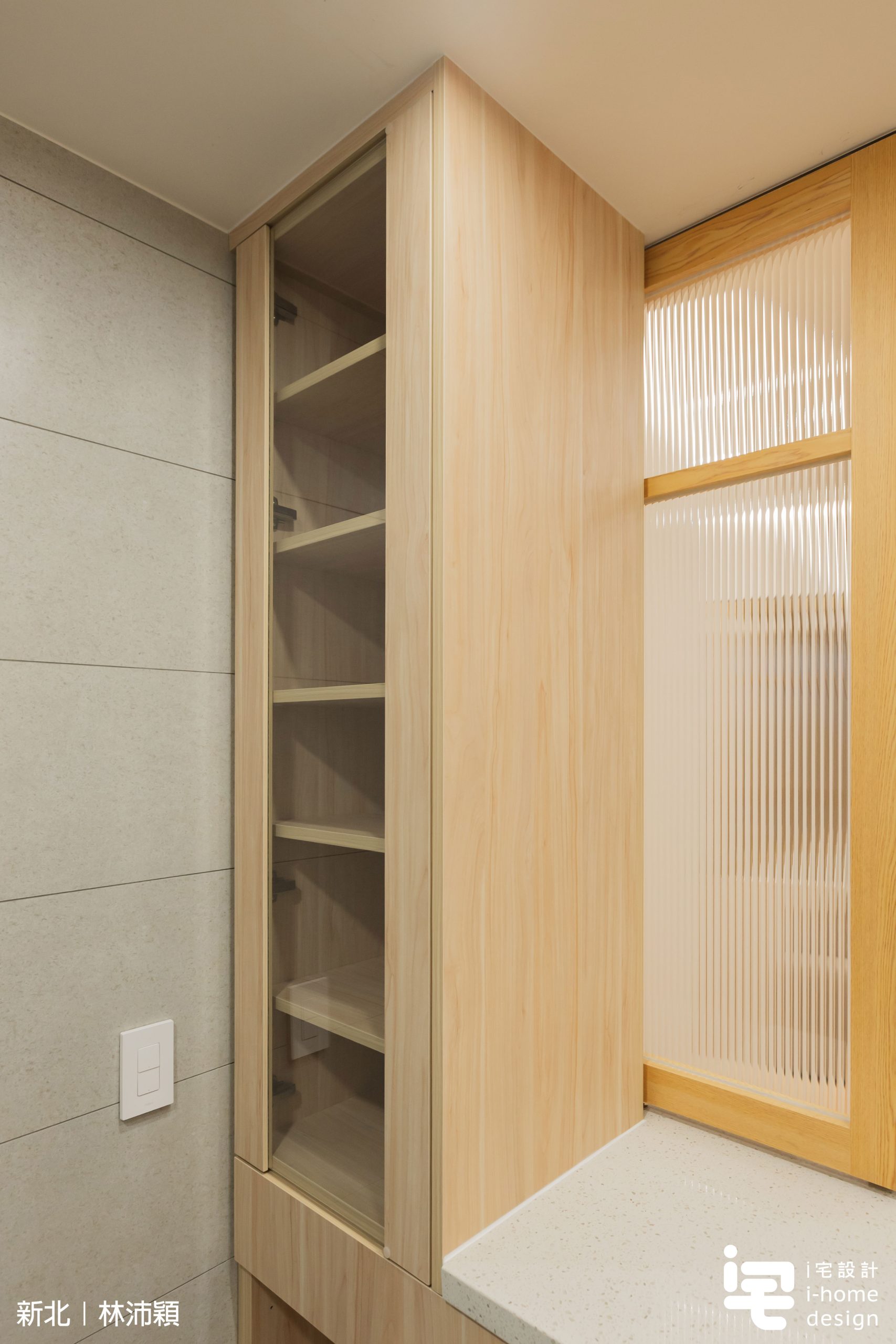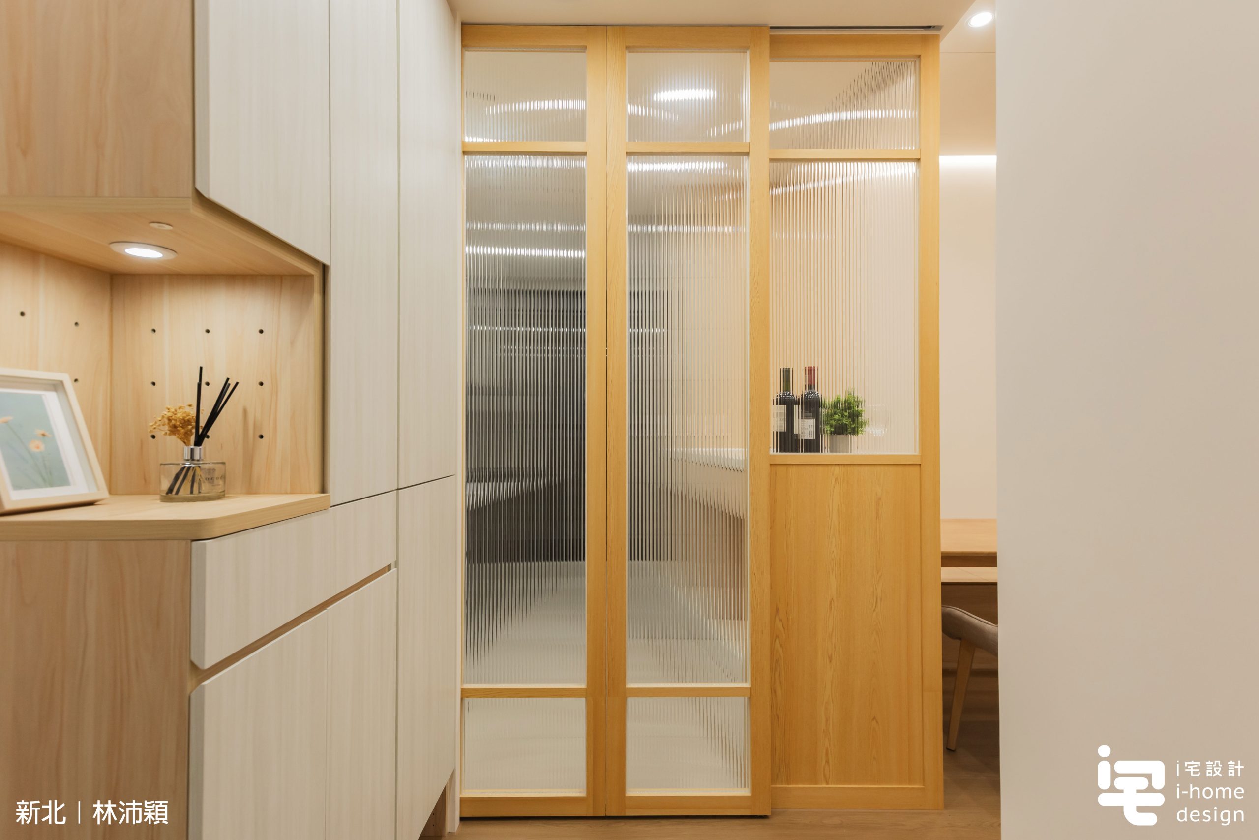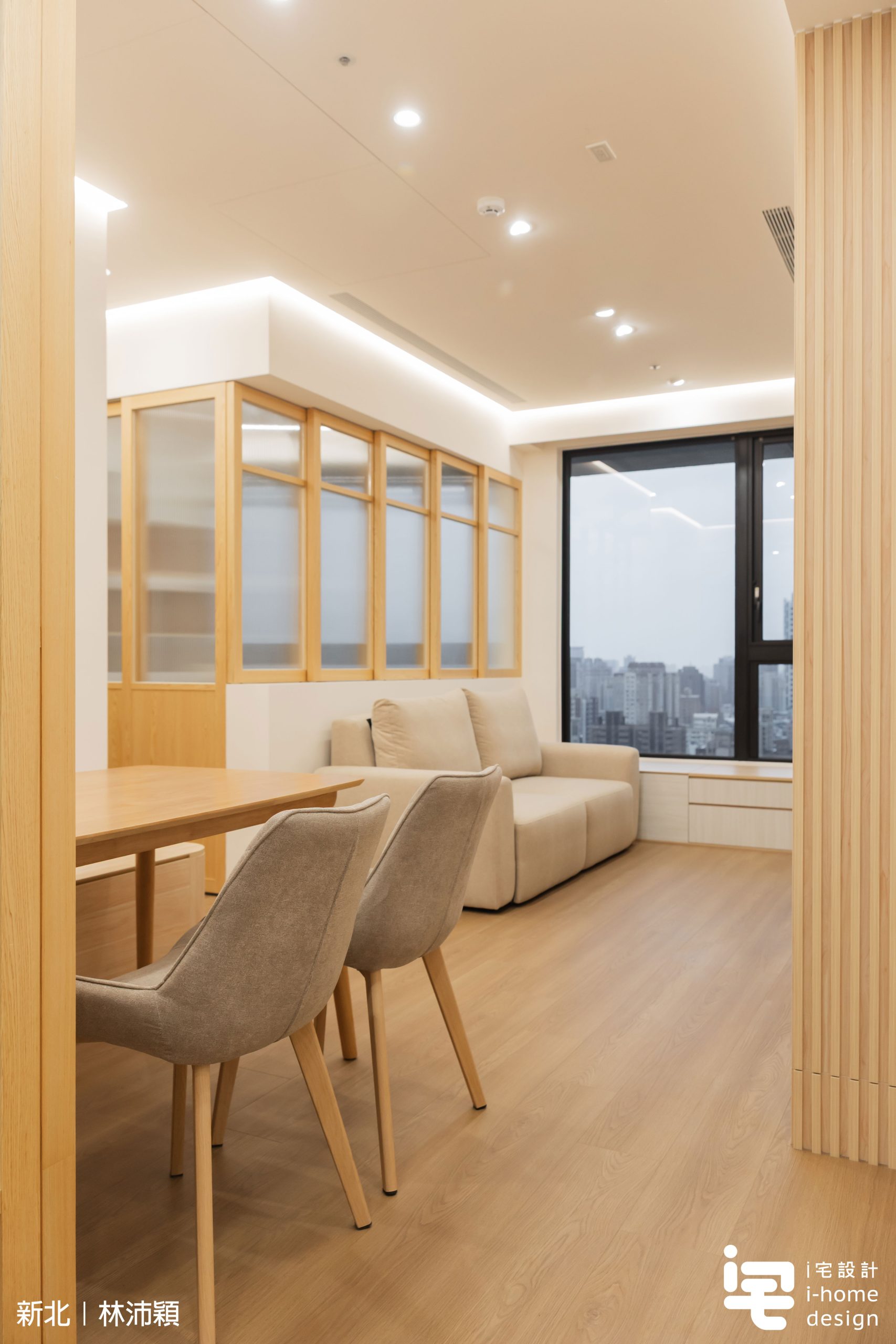 木作框搭配貼木皮與長虹玻璃,使廚房成為「隔而不斷」的場域,自然光線得以流動,提升整體日式空間質感。