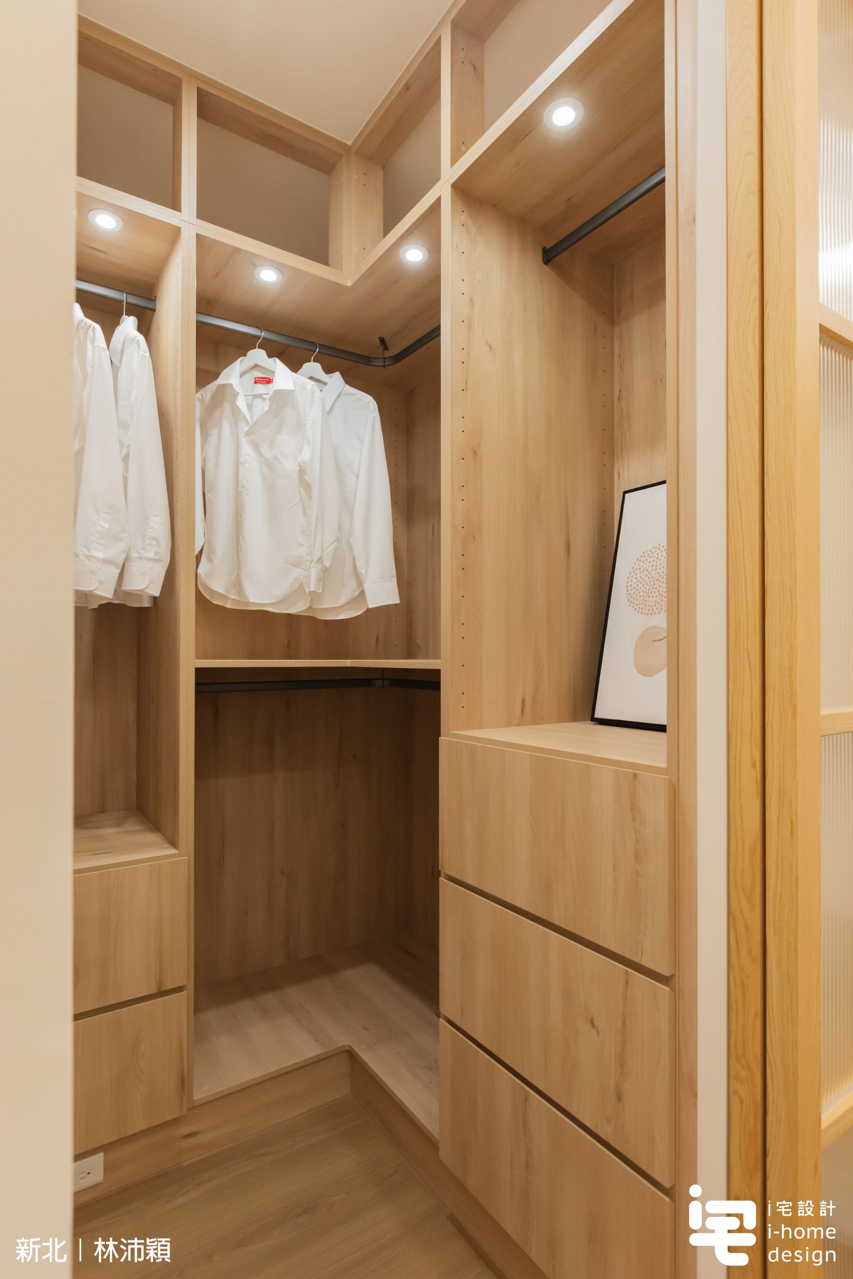 ▼更衣間以L型系統櫃整合吊掛、抽屜與頂部收納,搭配柔和燈光,提升使用便利與質感。
