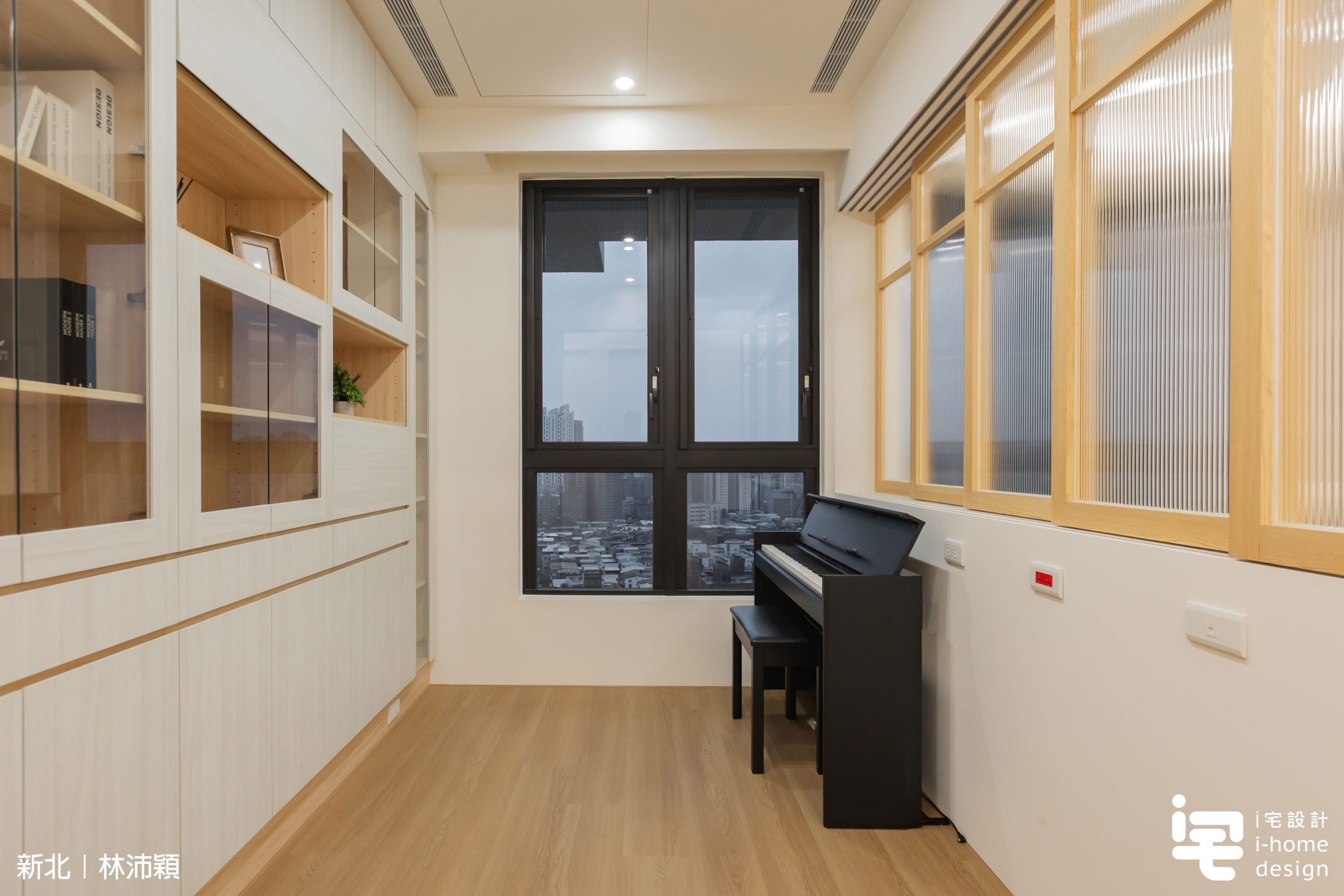 拆除原房間後重新規劃為多功能空間,透過半高牆與木作滑窗界定場域,並以滑窗作為空間區隔。當木作窗關上時,可作為書房或提供客人短暫休息;平時開啟則讓視覺自然延伸,使空間更加通透。木作窗採用長虹玻璃,引入自然光線,在兼顧隱私的同時維持整體明亮感。