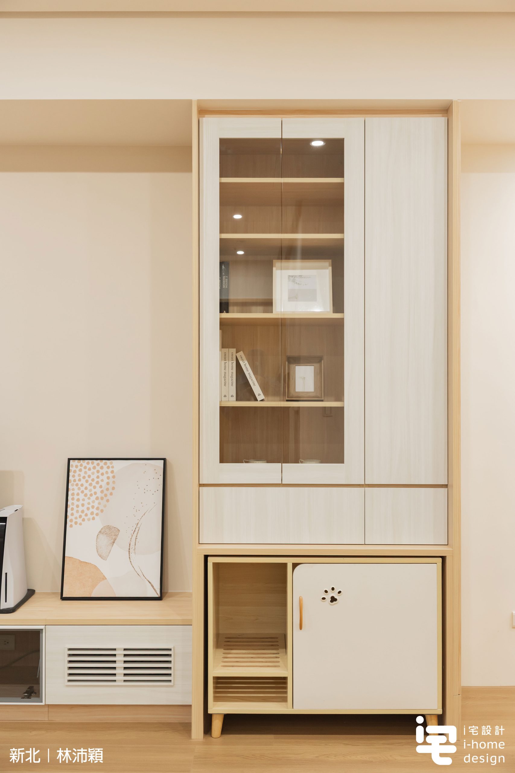 ▼考量屋主將原有貓砂櫃帶入新家,於是在系統櫃設計階段就預留貓砂櫃收納空間,巧妙整合於展示櫃與書櫃之中,使機能隱藏於立面內部,維持客廳整潔度與整體一致性,是兼具美感與實用的寵物友善室內設計。