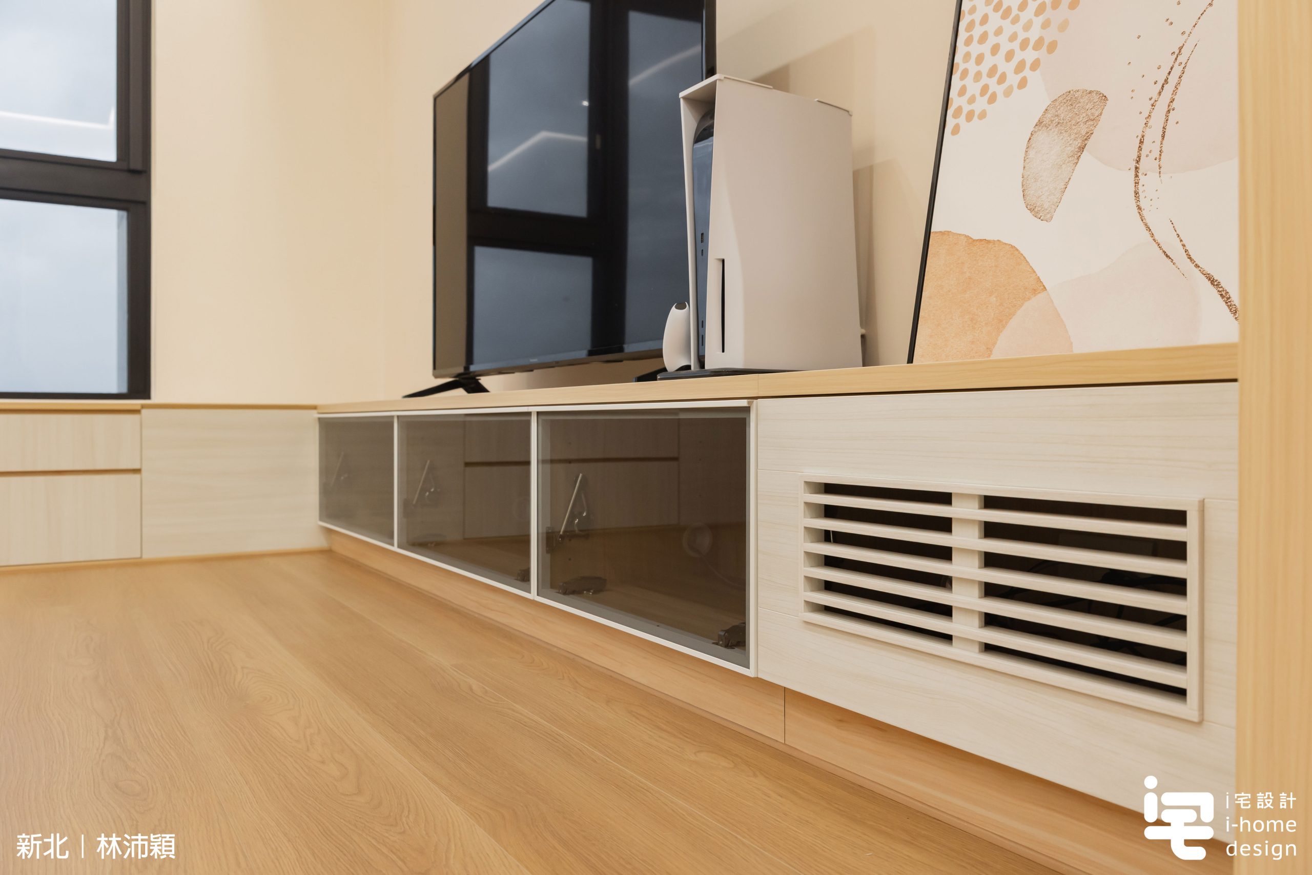 ▼電視下方設置玻璃門片收納櫃,兼顧展示與日常儲物機能;設備區則採用格柵門設計,滿足影音設備散熱需求,提升客廳電視牆收納的完整性。