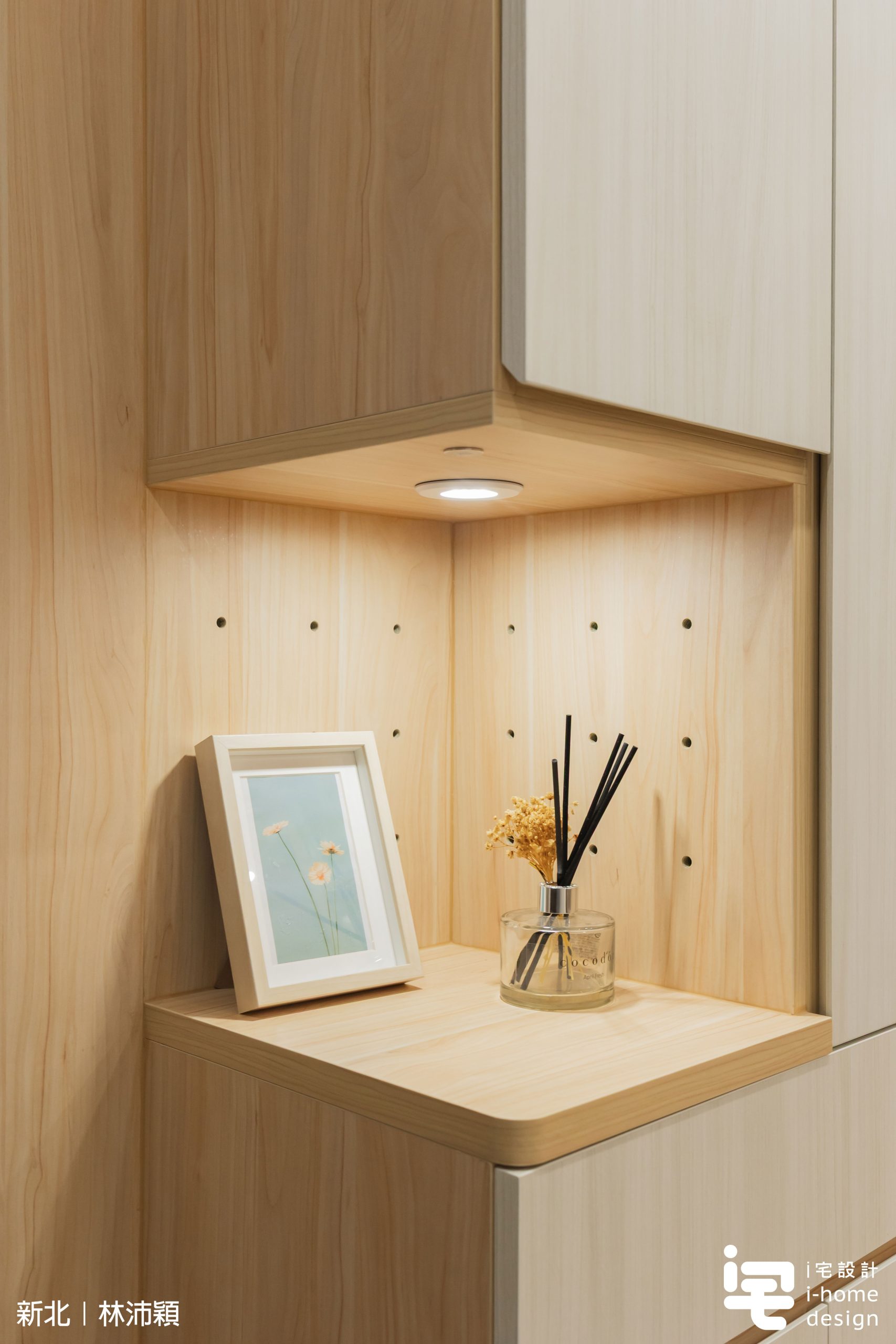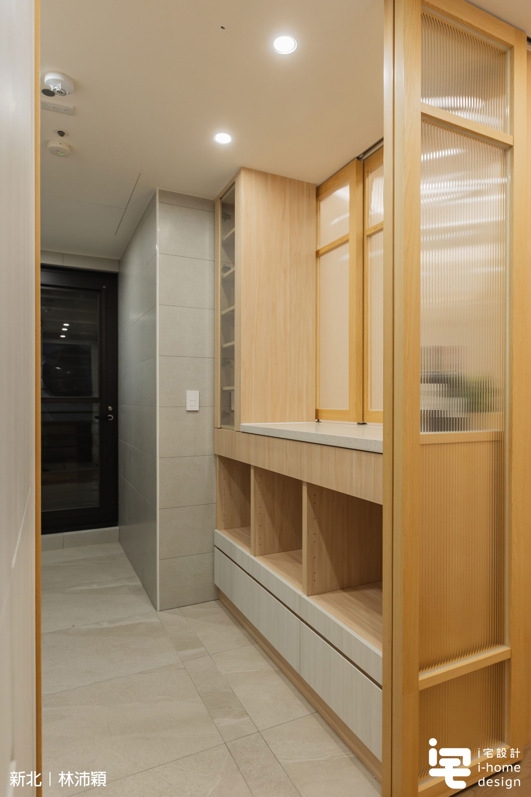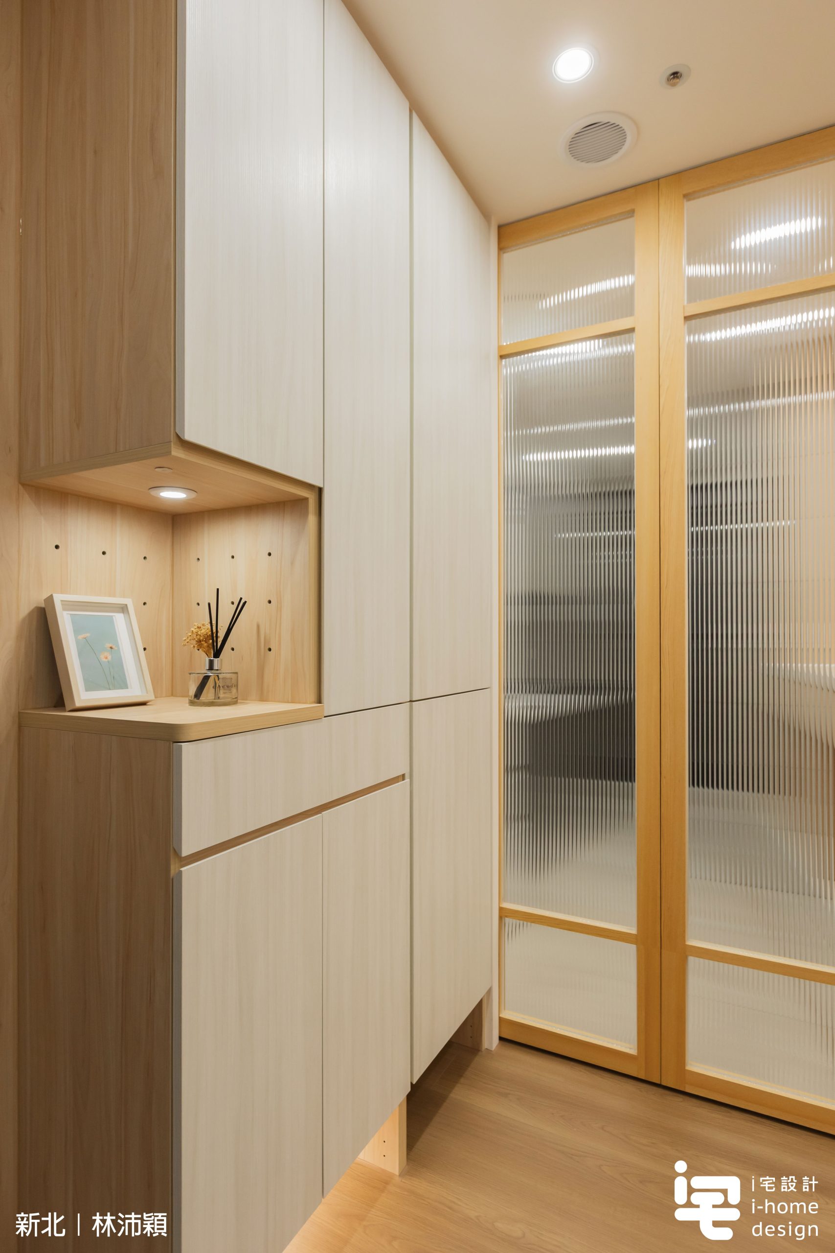 ▼鞋櫃採淺木色系統櫃設計,搭配懸空燈條與間接照明,透過光線柔化櫃體份量,使玄關空間更顯輕盈整潔。入口格柵元素則延續日式室內設計語彙,營造溫潤自然的回家儀式感。