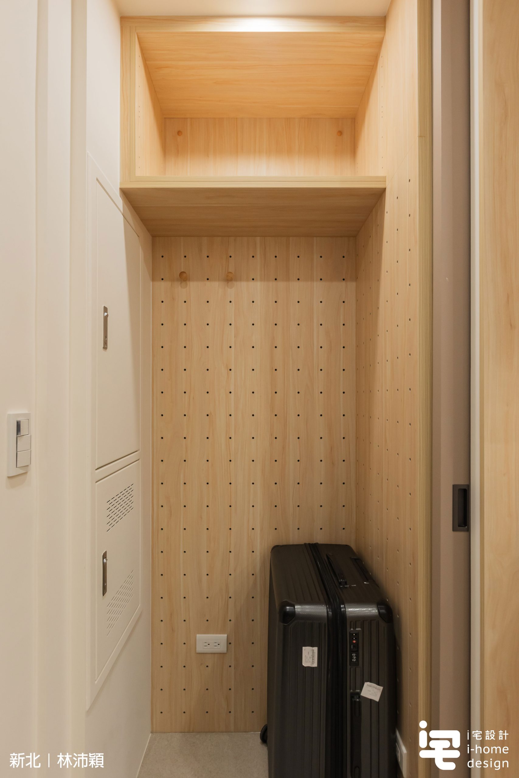 玄關規劃口袋滑門、洞洞板與鞋櫃收納系統,兼顧日常收納與空間整潔,提升玄關實用性與視覺清爽度。
